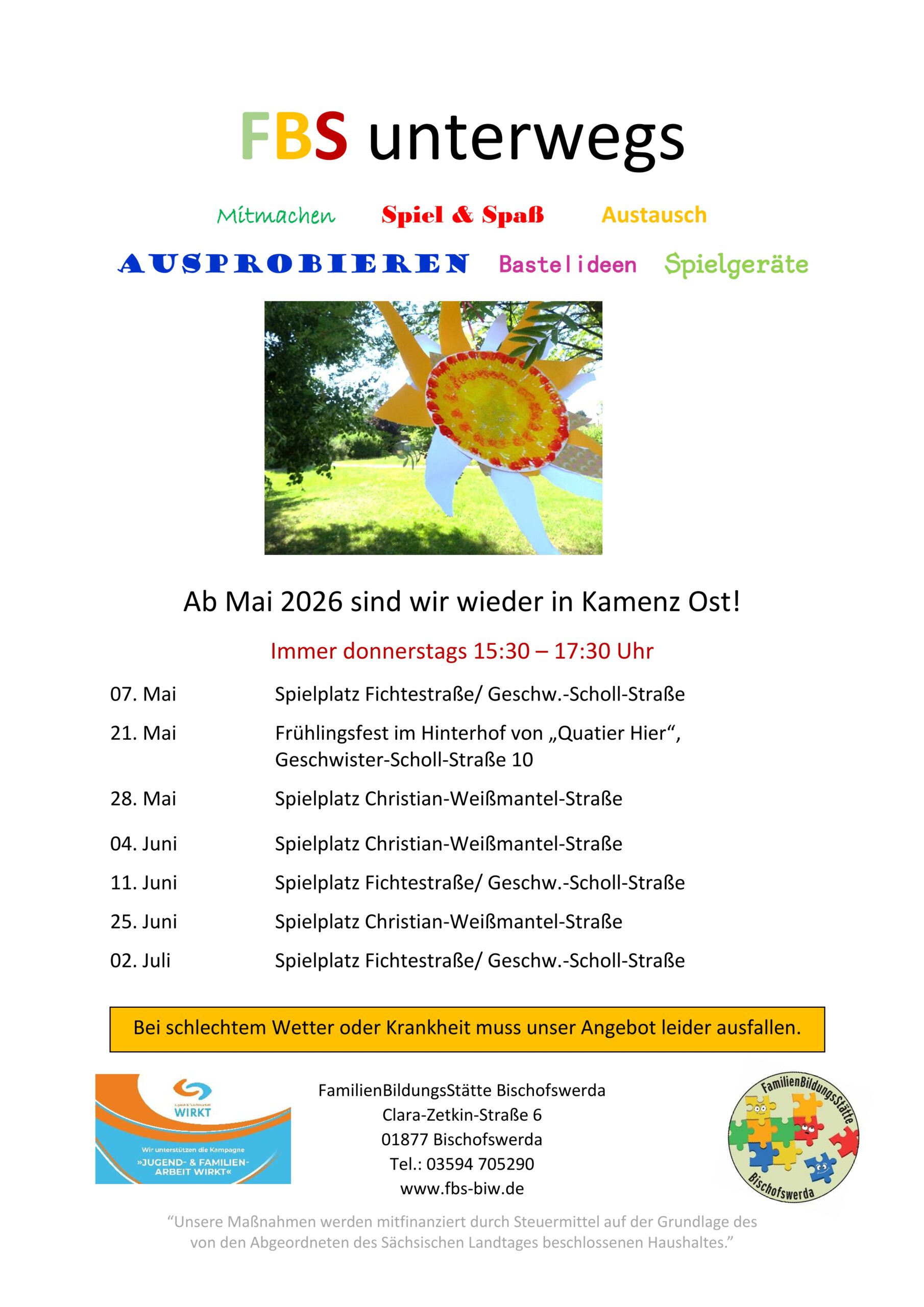 Im Mai starten wir wieder mit unserer Spielplatzarbeit in Kamenz Ost. Wann und auf welchem Spielplatz ihr uns findet verrät euch der Flyer.